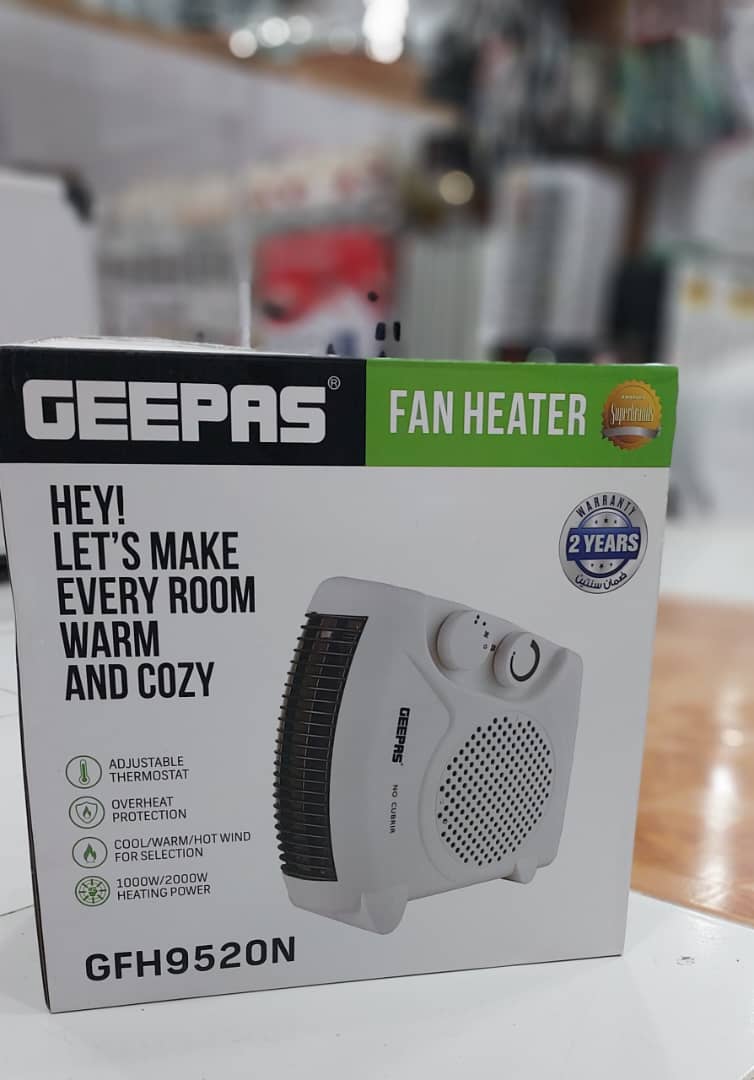 فن هیتر GEEPAS مدلGFH9520N ، یک دستگاه گرمایش کم حجم و وزن و با کارایی بالا و ایمنی مناسب می باشد. بدنه دستگاه از جنس مواد پلاستیک پلی کربنات مقاوم به حرارت بوده و از طرفی بعلت دمش توسط فن دستگاه ، حرارت به اندازه ای نمی رسد که پلاستیک آسیب ببیند . البته دستگاه در برابر گرم شدن بیش از حد به هر دلیل ، حفاظت شده است و با عمل کردن یک کلید بی متال اتصال الکتریکی المنت قطع شده ، گرمایش متوقف می شود. توان فن هیتر جیپاس قابل تنظیم در دو مقدار 1000 و 2000 وات است. همچنین دستگاه در وضعیت باد خنک بدون گرمایش نیز کار می کند .با ترموستات روی پنل دستگاه می توان دمای دلخواه را در محیط ایجاد کرد . دستگاه از یک فیوز 13 آمپر در داخل سه شاخه خارجی بهره می برد که به هنگام اتصال کوتاه و یا ایراد در دستگاه ، جهت جلوگیری از آسیب احتمالی به دستگاه و یا شبکه برق خانگی ، برق دستگاه را قطع می کند .
